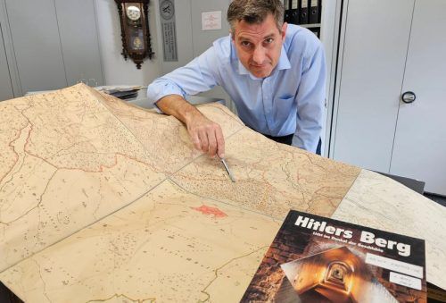 NS-Experte Florian Beierl mit Plänen des Munitionsstollens. Er schrieb das Buch „Hitlers Berg“.