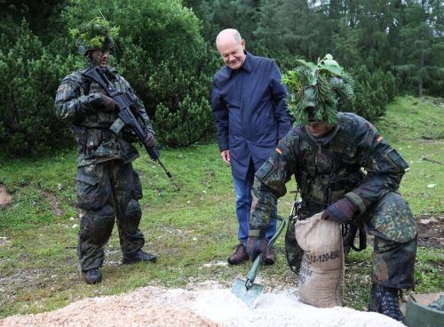 Olaf Scholz beobachtet eine Übung der Gebirgsjägerbrigade auf der Reiteralpe. © Alexandra Beier/dpa