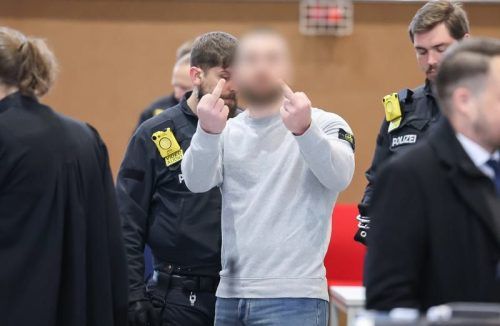 Ein Gruß zu Prozessauftakt: einer der angeklagten Automatensprenger vor Gericht. © dpa