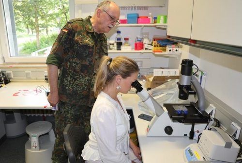 Die Ministerin am Mikroskop: Zecken-Experte Gerhard Dobler zeigt Judith Gerlach, wie das F