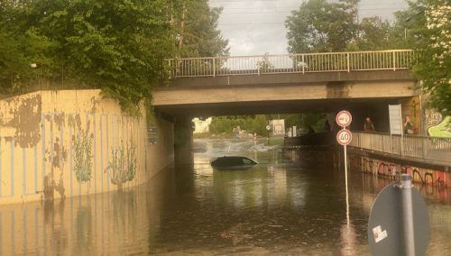 Die Lochhamer Unterführung bei Gräfelfing lief voll. Der BMW ist wohl Schrott. © Feuerwehr Gräfelfing