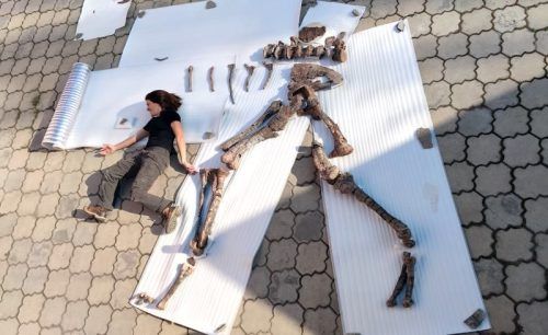 Die anatomisch korrekt angeordneten Skelettteile des Dinos neben einer Grabungsteilnehmerin. © privat