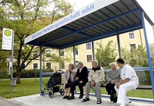 Warten auf den Bus, der nie kommt: Bis vor anderthalb Jahren stand vor einem Heim der Münchenstift noch eine Bushalte-Attrappe, die verhindern sollte, das Demenzkranke weglaufen. Heute setzt man im Heim auf eine andere Strategie. © Marcus Schlaf