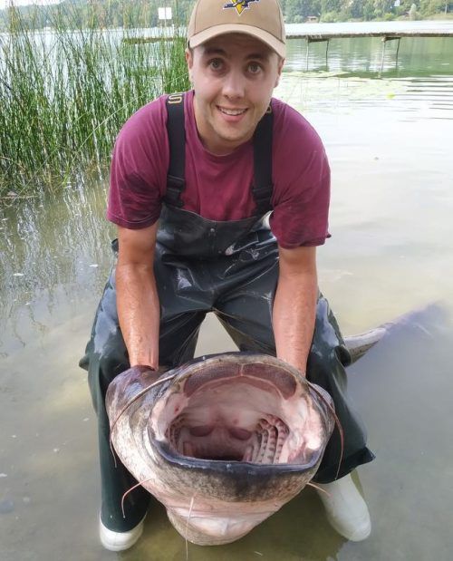 Jungfischer Tim Kosian hält den Mega-Wels in der Hand, den er im Pilsensee gefangen hat. © Fischereiverein Wörthsee-Pilsensee