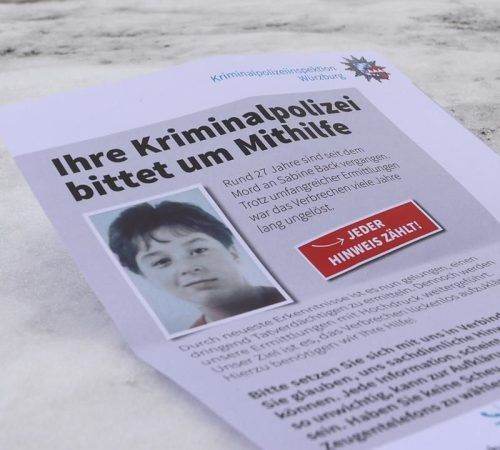 Ein Flugblatt, auf dem die Bevölkerung vor einigen Jahren um Hinweise auf den Mordfall Sabine Back gebeten wird. Nach einer neuerlichen Sichtung der Beweise glauben die Ermittler, den Täter