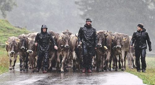 Ein pitschnasser Viehscheid: Die Bauern von Hinterstein im Allgäu haben ihre Rinder am Dienstag durch den strömenden Regen von hoch droben auf der Alm hinab ins Tal getrieben. © ANNA SZILAGYI/ epa