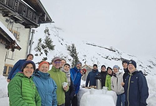 Mit Glühwein gegen den Hüttenkoller: Wanderer und Mitarbeiter der Tölzer Hütte lassen es sich trotz Schneechaos gut gehen. Links hinten