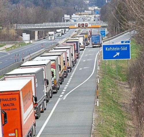 Fast Alltag: Lkw-Stau auf der Inntalautobahn an der Grenze Bayern/Tirol. Es ist mal wieder Blockabfertigung. © imago