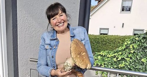 Der Riesen-Steinpilz hat einen Durchmesser von 30 Zentimetern und bringt 1,3 Kilo auf die Waage. Anita Nagelmüller freut sich über den Glücksfund ihres Mannes. © privat (2)