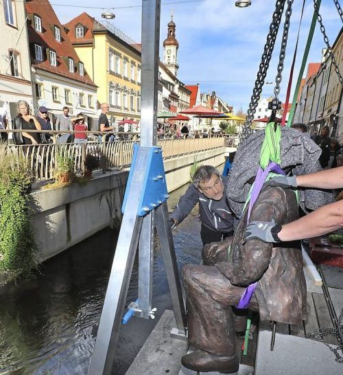 Freising – Karl Obermayr sitzt jetzt stabil am Ufer des Freisinger Stadtbachs, der Moosach, ist aber noch unter einer Gewebeplane verhüllt. Doch am kommenden Samstag um 15 Uhr wird es soweit sein: Dann wird die Bronzefigur in der Innenstadt feierlich