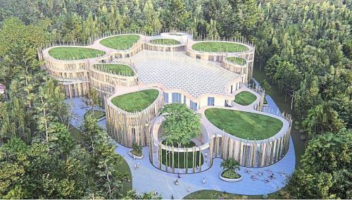 So soll es aussehen: Das Sportgymnasium für Geretsried hat Star-Architekt Daniel Libeskind entworfen. Optisch soll es sich in den Stadtwald einfügen. © Studio Libeskind