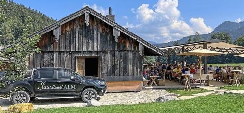 Blick auf die umstrittene Hütte: Links parkt ein Pickup des Betriebs mit der Aufschrift „Saurüsselalm“, rechter Hand sitzen die Gäste auf der Sonnenterrasse. © Thomas Plettenberg (2)