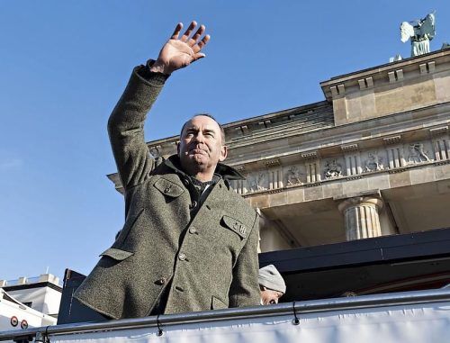 Hallo Berlin, ich komme (wenn denn der Wähler es will). Hubert Aiwanger am Brandenburger Tor, hier bei einer Protestkundgebung der Spediteure. © Stefan Zeitz/Geisler-Fotopress/pa