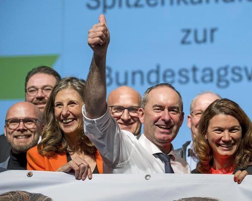 Hubert Aiwanger hebt seinen Arm und streckt einen Daumen nach oben, nachdem er zum Bundesvorsitzenden der Freien Wähler gewählt wurde. Neben ihm steht Indra Baier-Müller (3. von links), Direktkandidatin für die Bundestagswahl. © dpa