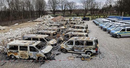 München – Das sieht man nicht oft: 22 Kleinbusse und ein Auto der Münchner Polizeihundestaffel, ausgebrannt, ein Fahrzeug neben dem anderen, drum herum Absperrband. Innenminister Joac