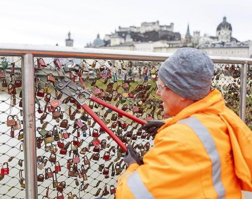 Sie sind Zeichen ewiger Liebe. Wer als Paar auf Wolke 7 schwebt, hängt ein Liebesschloss in der Öffentlichkeit auf. Bunte, individuell gravierte Vorhängeschlösser zieren deshalb Brücken in ganz Bayern. Die Stadt Salzburg aber musste mit denen jetzt kurzen Prozess machen: Bauhof-Mitarbeiter haben den
