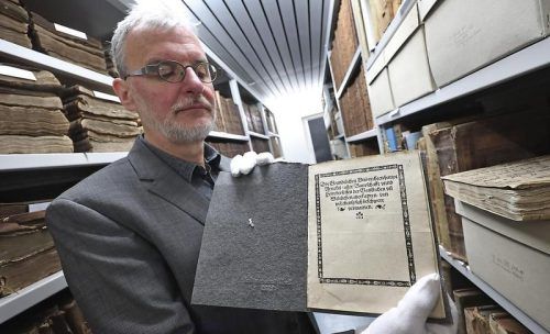 Archivar Christoph Engelhard vom Stadtarchiv Memmingen mit den 12 Artikeln. © Karl-Josef Hildenbrand/dpa