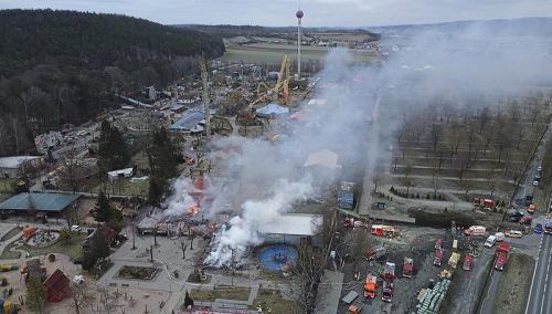 Dichte Rauchwolken steigen über dem Freizeitpark auf. Diese Drohnenaufnahme zeigt, wie es am Boden von Feuerwehrf