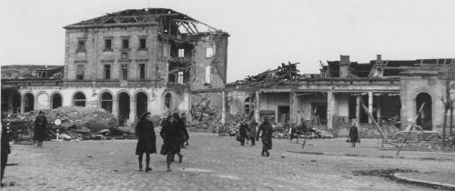 Als der Krieg zu Ende ging: Passanten vor dem zerstörten Aschaffenburger Hauptbahnhof. © Stadtarchiv, US Army/NARA