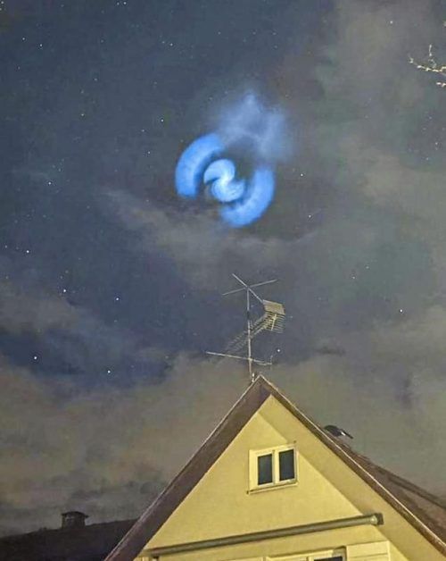 Die Lichtspirale war wie hier im Allgäu in großen Teilen Europas zu sehen. Sie stammte von einer SpaceX-Rakete, die einen Militärsatelliten ins All schoss. © Einsa