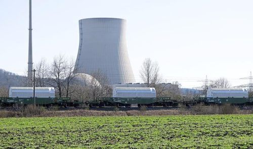 Angekommen: Waggons mit Castoren vor dem Kühlturm von Isar 2. © Sven Hoppe/dpa