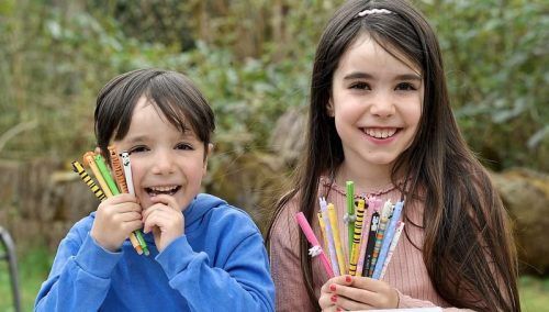 Schreibenlernen mit magischen Gelstiften: Julius (5) und Ella (7) aus München zeigen ihre Legami-Sammlung. © Marcus Schlaf