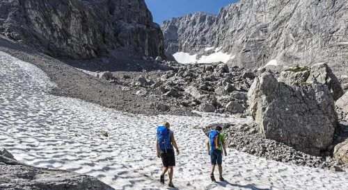 Zwei Wanderer im Gebirge: So ein Schneefeld sieht harmlos aus, kann aber tückisch sein und zur Falle werden. © DAV