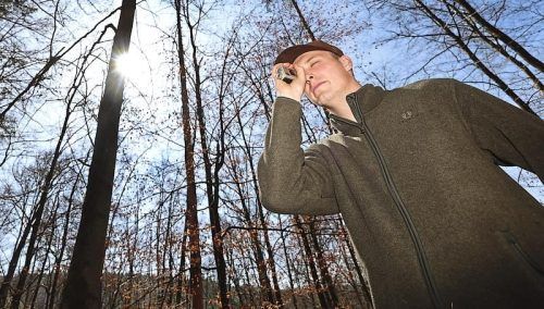 Angehender Forsttechniker: Moritz Winkus, Auszubildender zum Forsttechniker, misst im Rahmen seiner Ausbildung mit einem Ultraschall-Höhenmessgerät die Höhe eines Baumes. © dpa