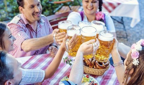 Eine kühle Mass Bier schmeckt im Sommer besonders gut zur Brotzeit: Diese Freunde stoßen an. © Getty