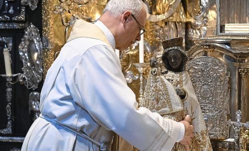 Der Stadtpfarrer Klaus Metzl berührt die Schwarze Madonna nur sehr vorsichtig. © dpa