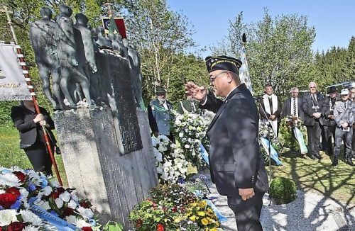 Howard S. High salutiert vor einem Mahnmal, das an den Dachauer Todesmarsch erinnert. Der Vertreter der „Japanese American Veterans Association“ war neben dem Holocaust-Überlebenden Abba Naor und US-Generalkonsul James Miller einer der Gäste, die am Freitag bei Reichersbeuern im Kreis Bad Tölz-Wolfr