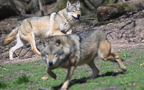 Zwei Europäische Wölfe (Canis lupus lupus), aufgenommen in einem Gehege. © Weißbrod/dpa