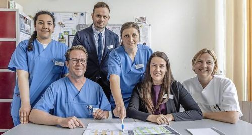 Auf Station 21 der Schön Klinik wird die Vier-Tage-Woche praktiziert: Pflegedienstleiterin Corina Klumpp, Stationsleitung Janine Leshchanka (2. und 3. v. r.) besprechen im Team den Dienstplan, Klinikleiter Tim Egger (Mitte) schaut zu. © Yannick Thedens