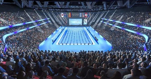 Blick in die Zukunft? So könnten die Schwimmwettbewerbe in der „Munich Arena“ bei Freising aussehen. Dazu muss die Halle aber erst einmal gebaut werden. © Munich Arena