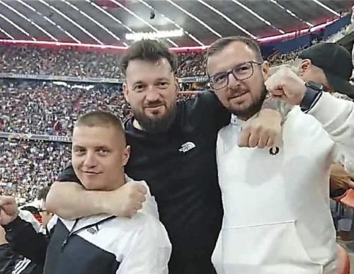 Das letzte Bild vor seinem Tod: Andrei S. (Mitte) besuchte mit seinen Freunden István (r.) und Zoltan am Sonntag die Allianz Arena. Dort stürzte er acht Meter in die Tiefe und starb. © privat