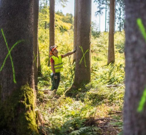 Auch eine Aufgabe für die Staatsforsten: der Kampf gegen den Borkenkäfer. Bäume, die weg müssen, werden mit einem x markiert. © Lino Mirgeler/dpa