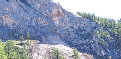 Ein großer Teil Berg ist abgerutscht: Das Bild zeigt den massiven Felsabbruch vom Montag. Das Gelände unterhalb ist samt der Wege verschüttet. © Kilian Pfeiffer (2)