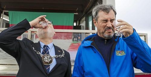 #Södertrinkt: Bayerns Ministerpräsident und Thorsten Pollmann, Bürgermeister von Helgoland, trinken einen Sherry. © Frank Molter/dpa (3)