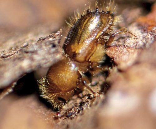 Ein Borkenkäfer auf einer Baumrinde. © Weigel/dpa