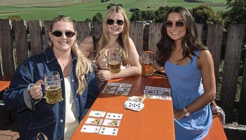Sonnenschein, weiß-blauer Himmel, dazu ein frisches Bier zum Kartenspiel – die perfekte Einstimmung auf den Wiesn-Start am Samstag. Das finden auch Cassidy (25), Regan (26) und Kiersten (25, v. li.). Die drei US-Amerikanerinnen machen eine Europa-Reise und haben gestern das Kloster Andechs besucht.