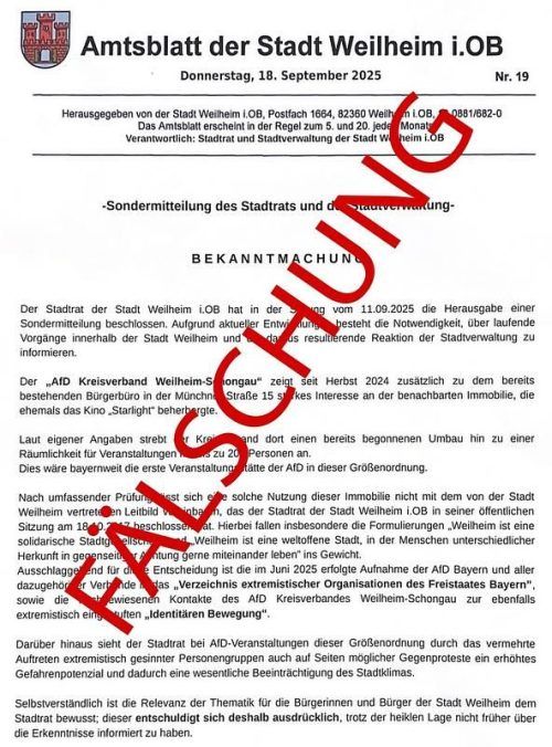 Weilheim – Nach der Anmietung eines ehemaligen Kinos in Weilheim durch die AfD schlagen die Wogen hoch. Mit einem gefälschten Amtsblatt protestieren Unbekannte gegen die Anmietung der Immobilie durch die rechtsradikale Partei. Weilheims Bürgermeister