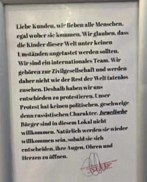 Israelische Bürger nicht willkommen: Dieser Aushang in Fürth sorgt für Entsetzen. © privat