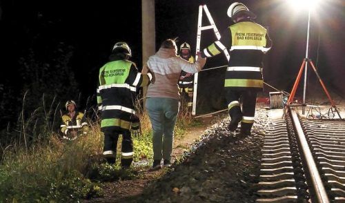 Einsatzkräfte bringen Passagiere über Gleise und eine steile Böschung in Sicherheit. © Bartl
