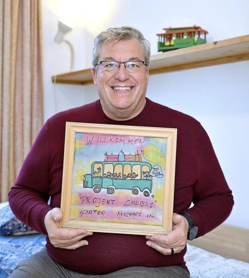 Hilfe für die Familien kranker Kinder: Bruder Thomas Abrell zeigt ein Bild, dass Kinder einmal für das Projekt Omnibus gemalt haben. © Astrid Schmidhuber