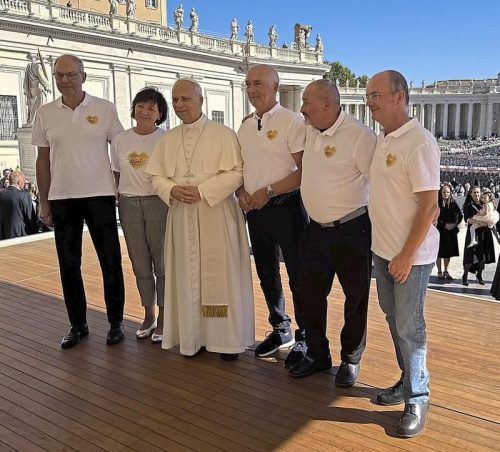 Auf Augenhöhe: Papst Leo mit den Vertretern des Betroffenenbeirats Herbert Fuchs, Elisabeth Geitner, Richard Kick, Helmut Bader und Sepp Germeier (von links). © Christine Schmehrer