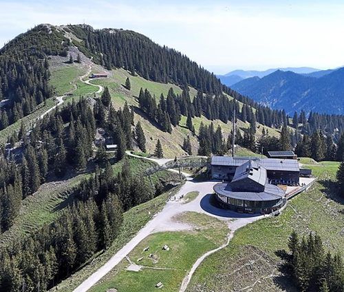 Blick auf den Wallberg hoch über Rottach-Egern. Davor liegt die Bergstation der Seilbahn mit Panoramarestaurant. Auf der Terrasse rechts soll die Party steigen. © Wagner/picture alliance