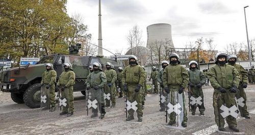 Aufmarsch vor dem AKW: Soldaten bei der Übung „Marshal Power“ gestern in Essenbach. © STACHE/AFP