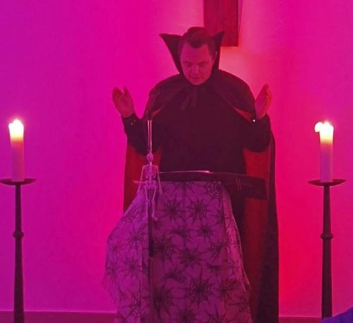 Mit Dracula-Umhang feierte der Freisinger Pfarrvikar Michael Korell den Halloween-Gottesdienst. Nun gab es Kritik.