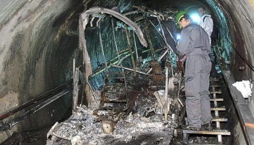 Vor 25 Jahren: Bergungsarbeiter bei der Inspektion von Überresten der ausgebrannten Gletscherbahn. © Franz Neumayr/dpa