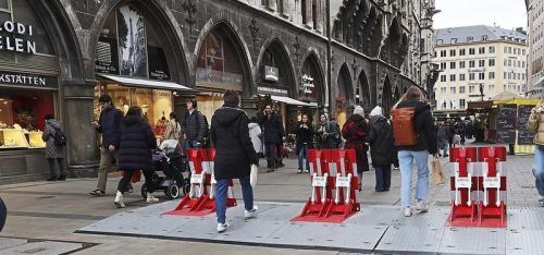 Barrieren, wie hier 2024 am Münchner Rathaus, sollen die Besucher schützen. Kommunen klagen über die Kosten-Explosion bei der Terror-